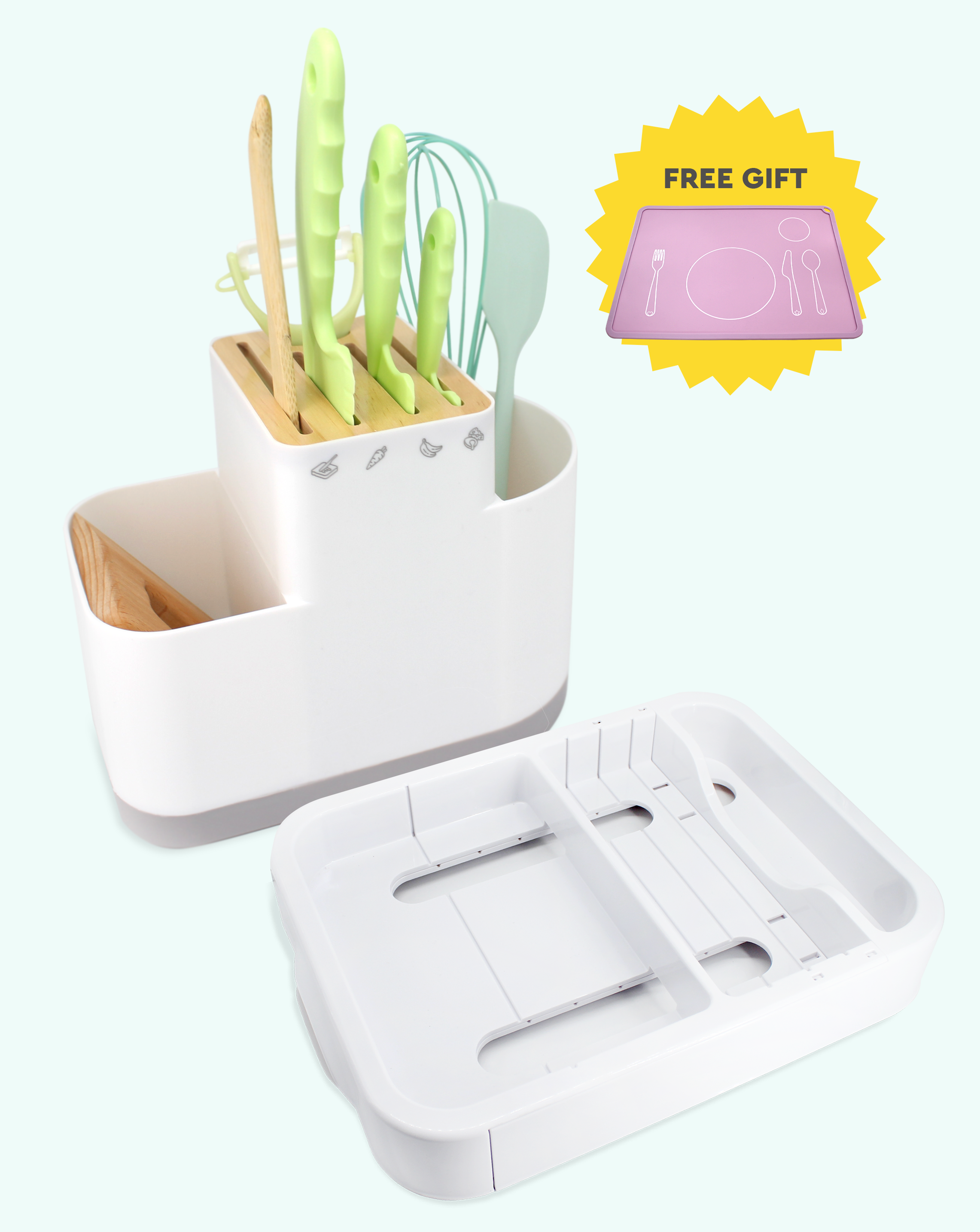 KIT INCLUDES: Four child-friendly knives / Wooden chopper / Kid-safe plastic peeler / Child-sized whisk and spatula / Kitchen tool organiser