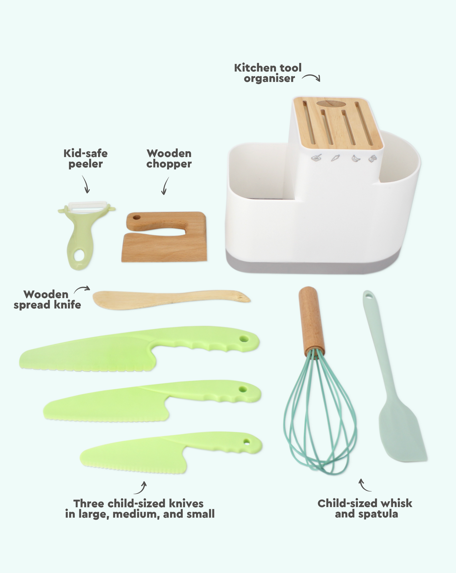 This set includes all the key tools for your child to help with everyday cooking: child-friendly knives, a wooden chopper, kid-safe plastic peeler, harmless plastic scissors, a child-sized whisk and spatula. It’s everything they need to safely assist in preparing meals from start to finish.